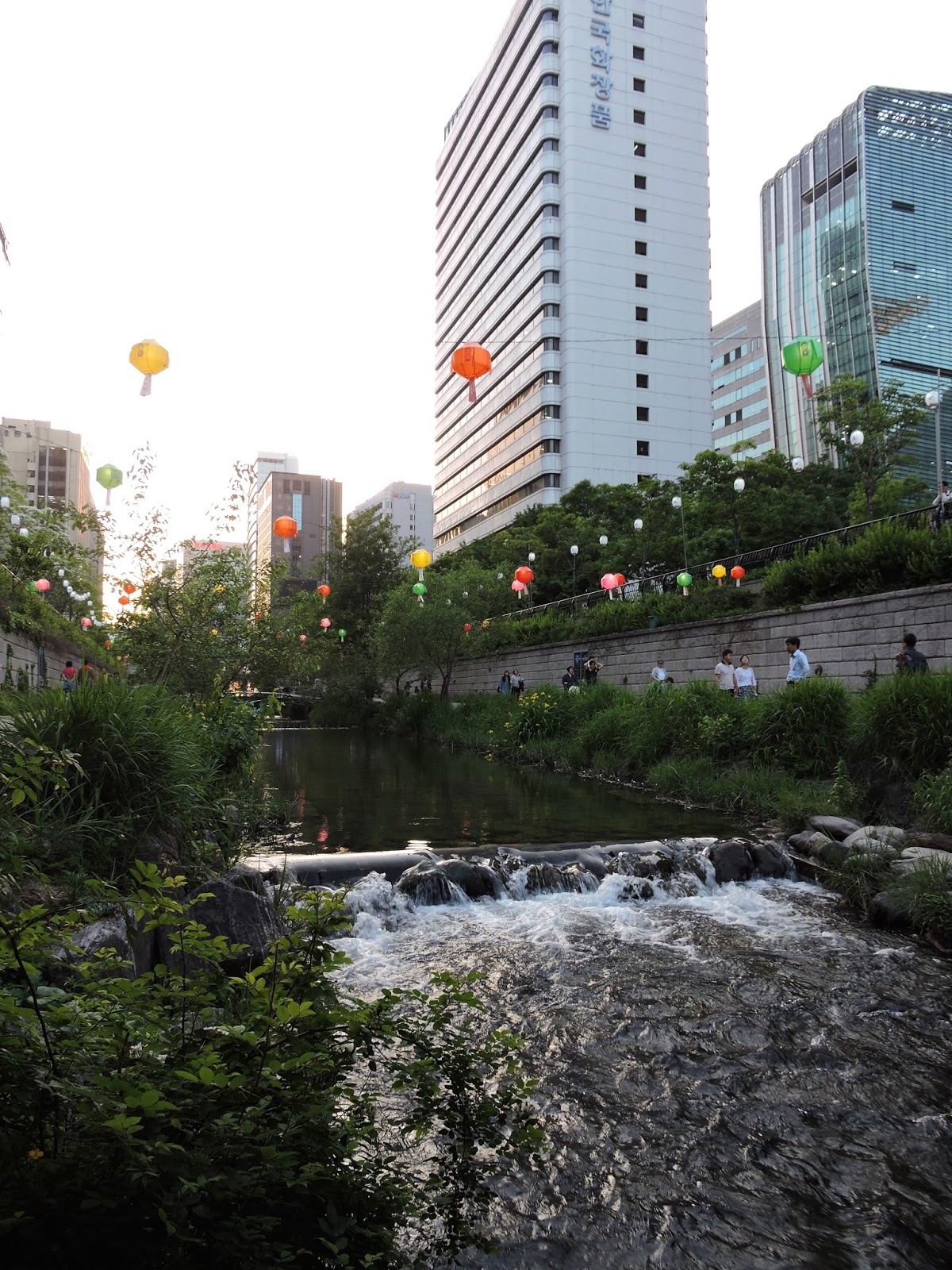 Après une dernière petite promenade autour de la maison de thé, je me suis dirigée vers ce qui reste aujourd’hui mon coin favori de Séoul, le Cheong-gye-cheon, une rivière souterraine rendue à la lumière du jour après de grands travaux, et dont la vue rafraîchit bien mieux que le titanesque Han (je ne l’ai pas précisé, mais il faisait près de 30 degrés lors de mon passage en Corée). La rivière est bordée d’arbres et de fleurs, et des sortes de gros cailloux lui apportent un peu de dénivelé, créant des rapides agréables à la vue et des glouglous agréables à l’oreille. J’aime vraiment ce genre d’ambiance urbaine, le cours d’eau au milieu des gratte-ciel ; c’est tout à fait l’image que je me fais d’une grande ville de roman d’anticipation.